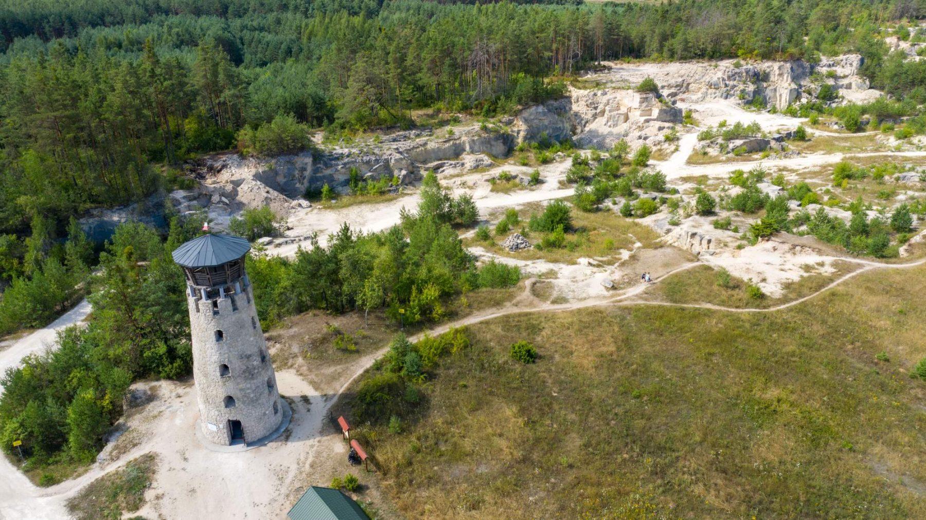 Tuż przy wejściu na teren kamieniołomu znajduje się parking oraz wieża widokowa. Liczy 18.5 metra wysokości, a na wysokości blisko 12 metrów w jego wnętrzu jest taras widokowy. Wejście jest darmowe.